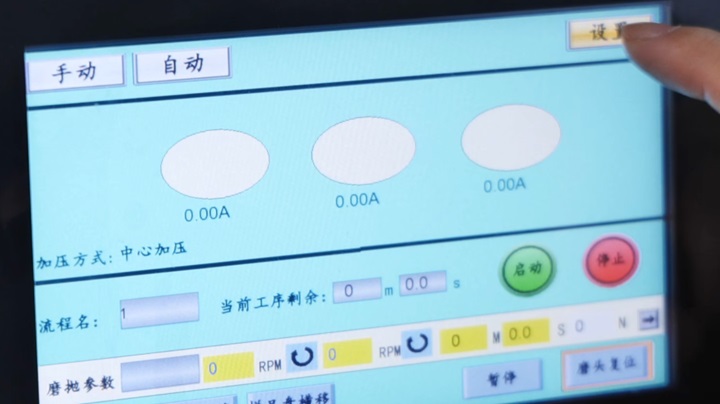 1. 全自动模式:内置99套可设置、可调用的工艺流程,每套工艺可包含10步工序参数,磨盘与磨头转速、磨抛时间等关键参数一键调取。