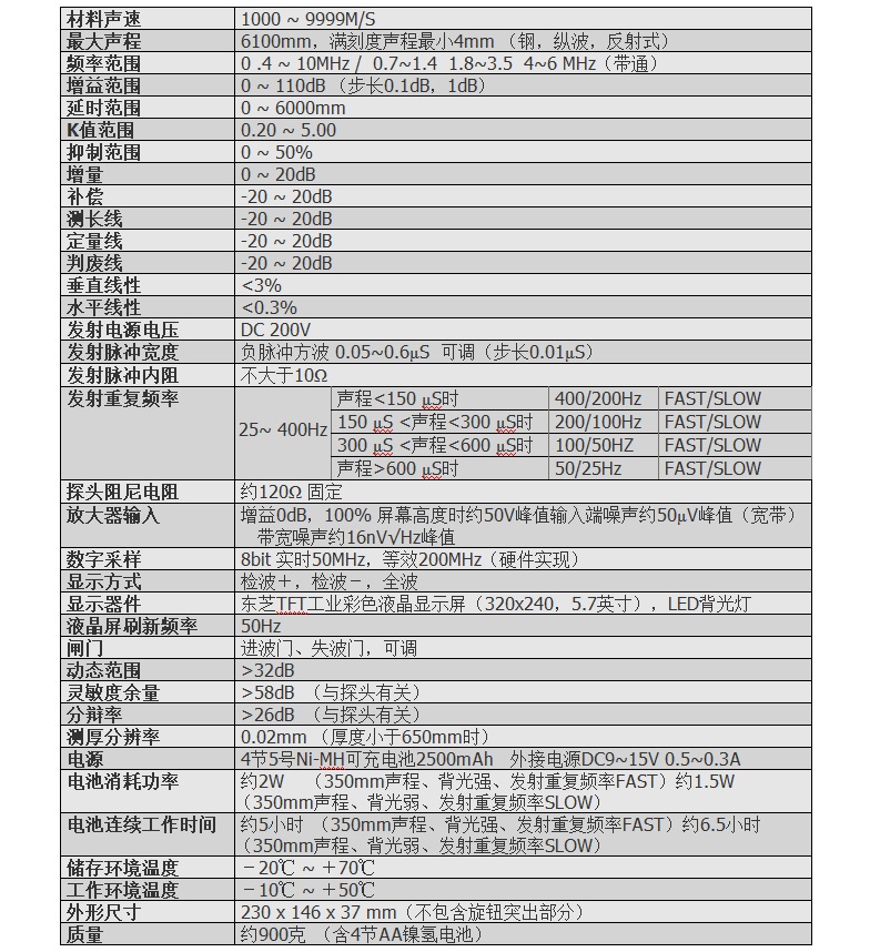 2.首创可变等分刻度,估算回波距离非常方便。大部份仪器的水平距离刻度,分成10等分,微调量程时,每等分所代表的距离也响应变化,例如满度100mm量程,每等分10mm,第三格30mm,第四格40mm很容易心算。但如把量程增加到例如116mm,则每等分代表11.6mm,第三格=11.6x3=34.8mm用心算不太容易了,再假如延迟设定为29.4mm,则还要加上29.4,太不方便了。JUT900采用可变等分刻度技术,每等分所代表的距离,必定是1,2,5,10,20,50,100,200,500,1000mm之中的一个。再举相同例子,量程调116mm时,每等分20mm,共116/20=5.8等分,再微调量程后,每等分20mm不变,仅等分数改变,这就是可变等分的原理。如果量程改变很大,除出来的等分数不在4到10范围之间,就会在上面10个数列中挑选一个合适的数,作为每等分所代表的距离。本机还在每个刻度下标出距离,所以延时如不为零也不会带来距离判断上的困难。